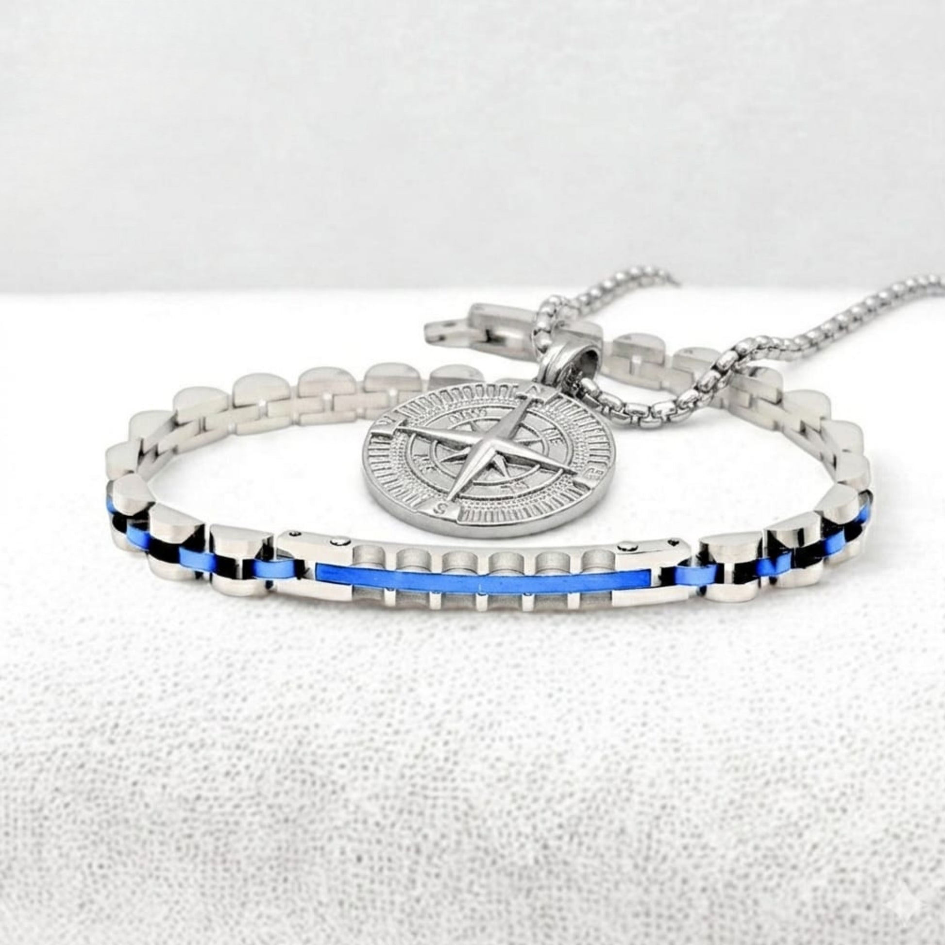 Stand strong in your journey with the Oceanic Navigator Bundle by Overpowered Accessories. Made from premium 316Lstainless steel, these pieces are built to last with no rust, tarnish, or fading. The sophisticated silver and blue steel finish paired with the detailed compass pendant symbolizes guidance, protection, and the courage to follow your "True North," providing a powerful finishing touch for everyday wear or as a prestigious executive gift in Egypt.