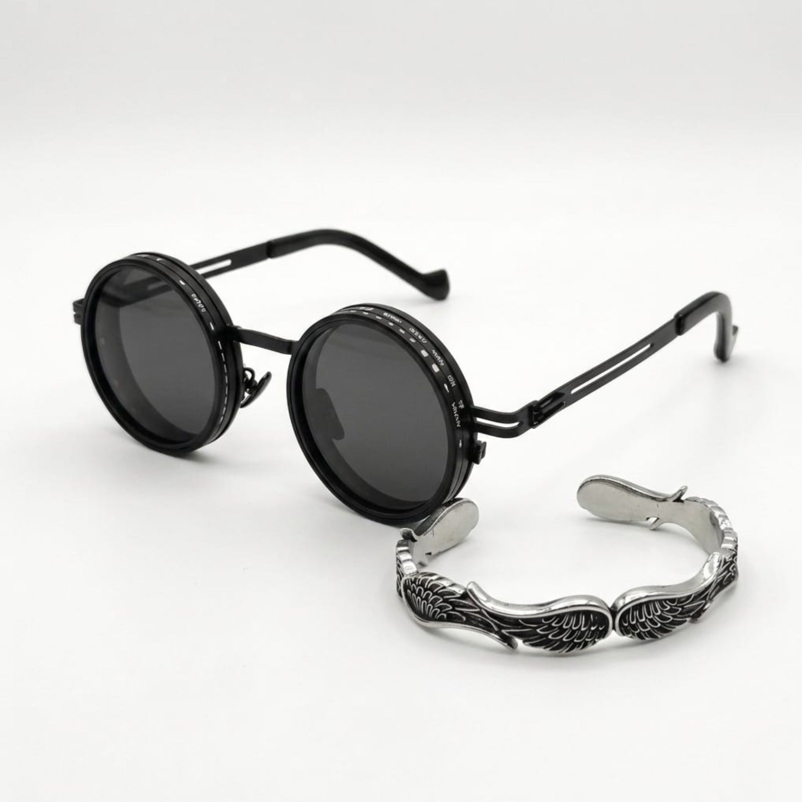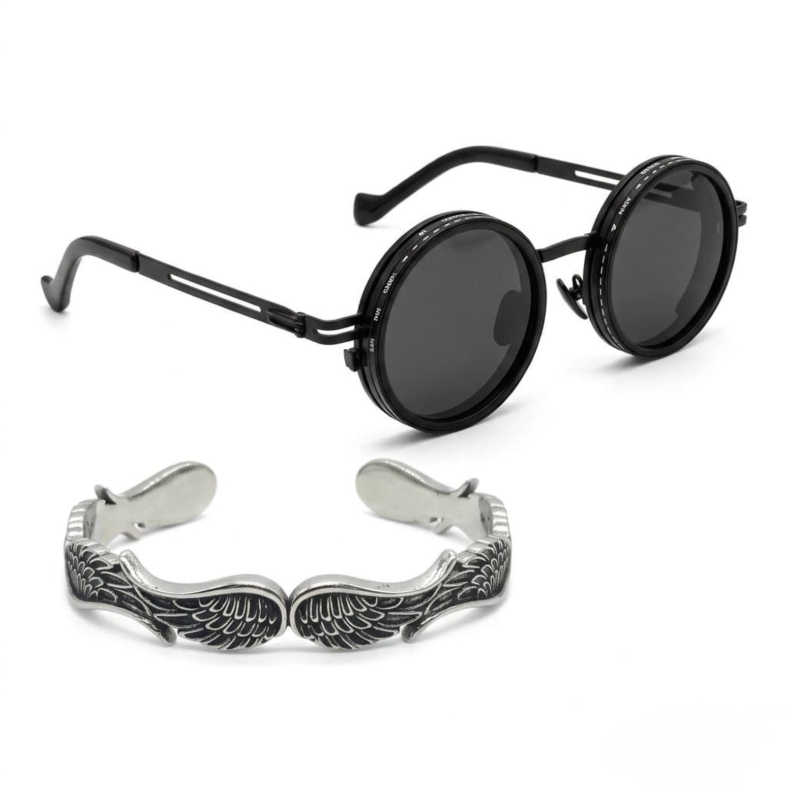 - Premium 316L Stainless Steel Construction — both the sunglasses frame and the wing bracelet are engineered from surgical-grade steel for extreme durability, high-polish finish, and total skin compatibility.